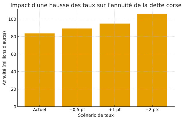 Avec la dégradation de la note française, l’État devra offrir des taux d’intérêt plus élevés pour financer sa dette. Ces conditions se répercutent sur l’ensemble de la sphère publique. La Corse, en quête régulière de nouveaux crédits pour maintenir ses investissements, risque de devoir emprunter plus cher. Chaque hausse de taux pèse lourdement : +0,5 point ferait passer l’annuité de remboursement de 83,6 à 89,2 millions d’euros (+5,6 M€), +1 point à 94,8 M€ (+11,2 M€), et +2 points à 106 M€, soit +22,4 M€ par an. À ce niveau, c’est l’équivalent d’un budget entier d’investissement qui s’évapore dans le service de la dette.