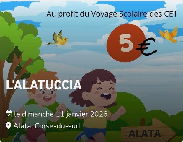 L’association “Caminendu” organise, ce dimanche 11 janvier au village d’Alata, la première édition de “L’Alatuccia”, une course dédiée aux enfants de 5 à 10 ans. Un moment ludique et convivial où chacun des garçons et filles sera à l’honneur. “Il ne s’agit pas d’une compétition proprement dite, rappelle Mme Durand, enseignante à l’école d’Alata-Prunu, mais d’instants de joie, de partage et de solidarité entre tous. Une médaille sera remise à chaque participant au terme de la course.”