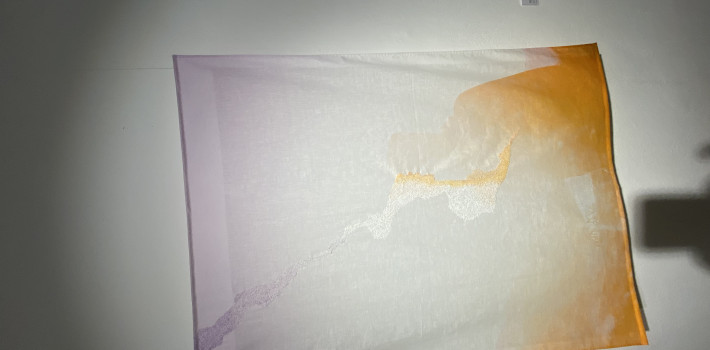 • Sur du lin, du coton, de l’organza, les œuvres sont vaporeuses, offertes au moindre souffle d’air qui les caresse et leur permet d’initier du mouvement, marque du vivant. Fantasmagorie ? Pourquoi pas… Séduction encore du travail sur Canson d’une rare finesse. Brodées, perforées, détissées, imprimées, les œuvres sont l’évanescence même et leur fragilité impressionne. Elles orchestrent des jeux de lumière à l’origine de mutations marines et de paysages en constante évolution. Lumière reine. Lumière aux nuances les plus douces ou les plus éclatantes. Lumière, incitation à la méditation et à la contemplation.