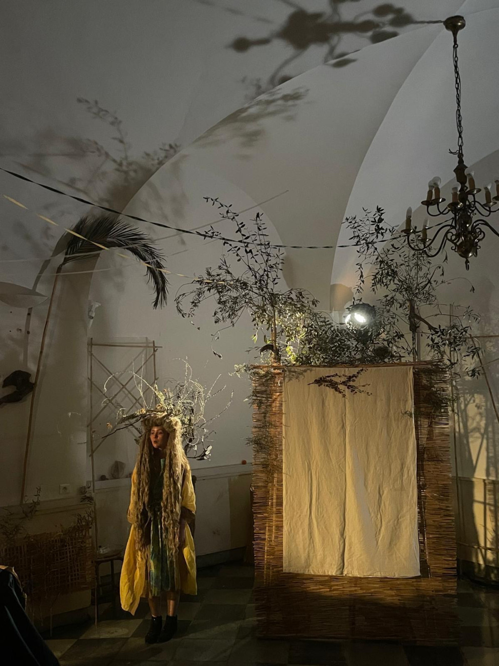 Elle avance toute frêle jeune fille : Juliette. Pas à pas, lentement, elle se raconte. Sur le front, une immense couronne qui tangue un peu et qu’elle maintient du bout des doigts contre le souffle du mauvais sort, peut-être. Pour l’amour d’un aimé, sans aucun doute. La couronne est large mais harmonieuse, garnie de branchages et de brindilles. Coiffe étrange et élégante dans sa rusticité mêlée de grâce.