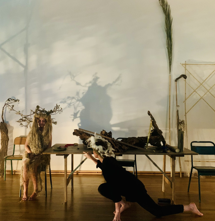 La scénographie, l’art, la manière de se servir d’un matériel naturel d’une extrême simplicité par Johnny Lebigot sont un atout maître du spectacle. Objets confectionnés de sa main, masques, panneaux clairs, pans de tissus, couleurs paille d’herbes sèches, rameaux d’olivier, d’osier enrichissent la tonalité de la mise en scène, façon de relier l’élément terre à la psyché des personnages.