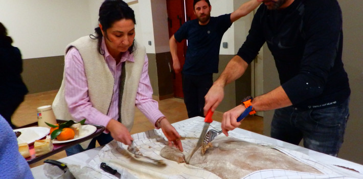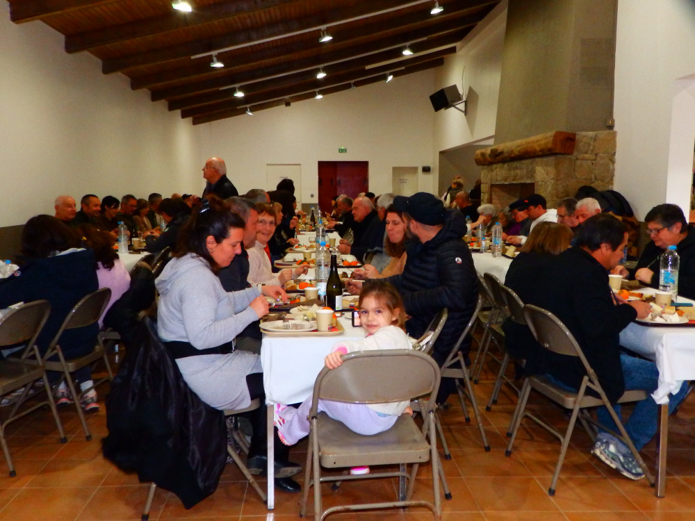 Ainsi donc, comme depuis quarante ans, le dimanche 1er février, la messe célébrée par le père Georges à la chapelle Saint-Roch était suivie du repas typiquement corse : la traditionnelle pulenda, préparée par l’équipe du Comitatu à la salle polyvalente de la commune, où la cheminée ronflait en réchauffant les convives. À l’extérieur de la salle, des grillades étaient également proposées. Des artisans ayant installé leur échoppe vendaient leurs produits. Ainsi, les visiteurs profitèrent des vertus gustatives du « roi de la fête », le cochon, sous toutes ses formes. Pour information, la farine de châtaigne provenait de chez Timoteï Mercoury Hardy, le figatellu de José Versini, le brocciu d’Ours-Pierre Alfonsi et de Pierre-Thomas Allegrini, le fromage de Wheatcroft.